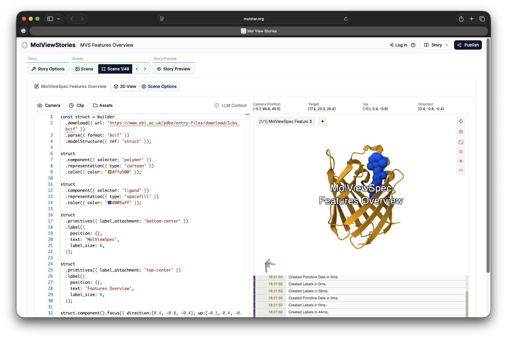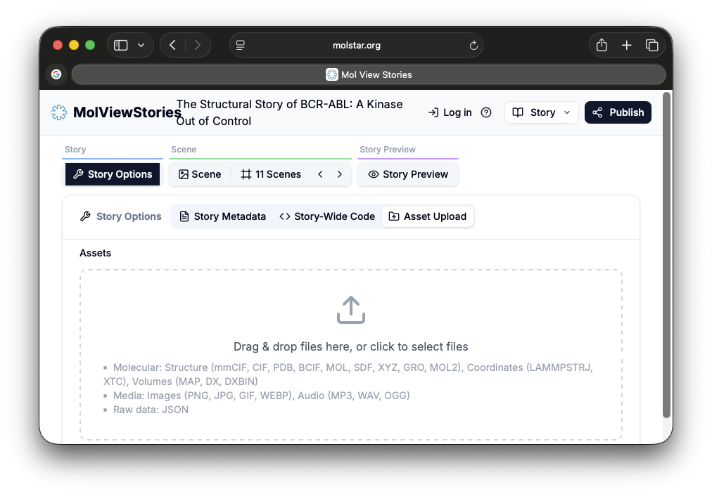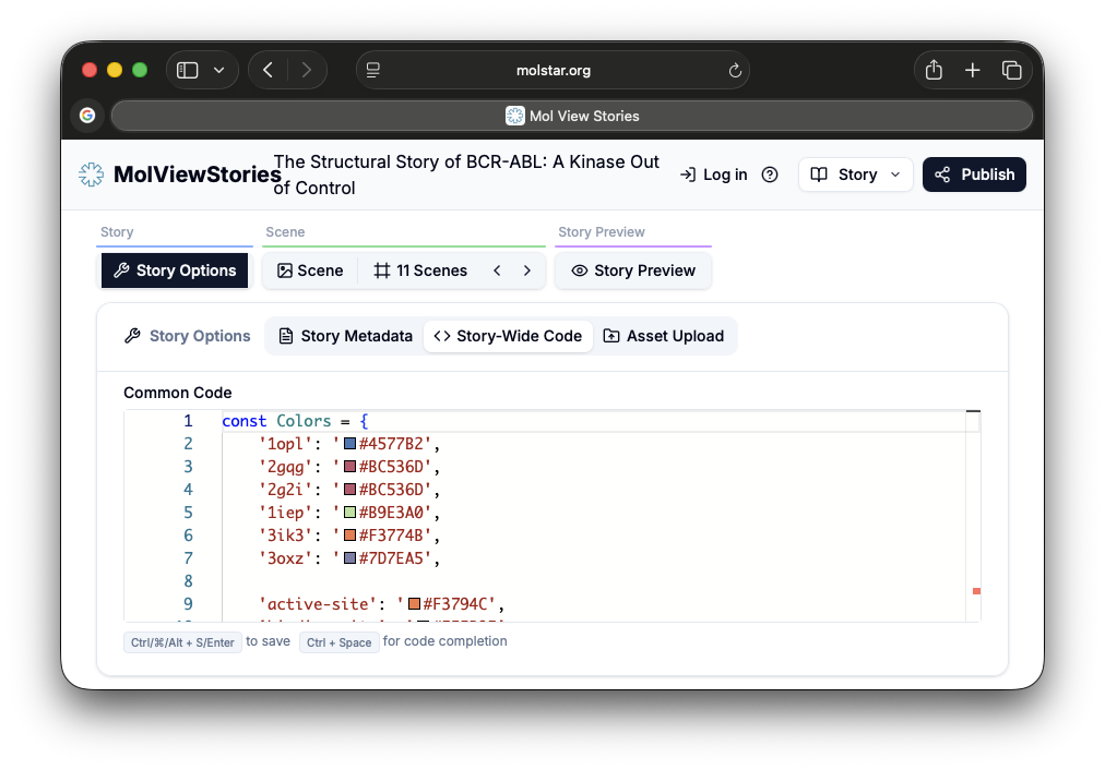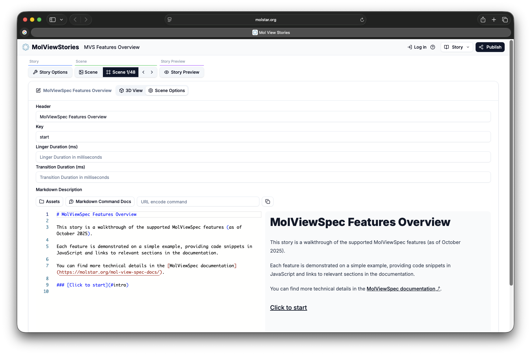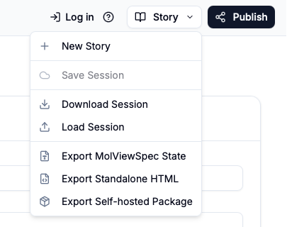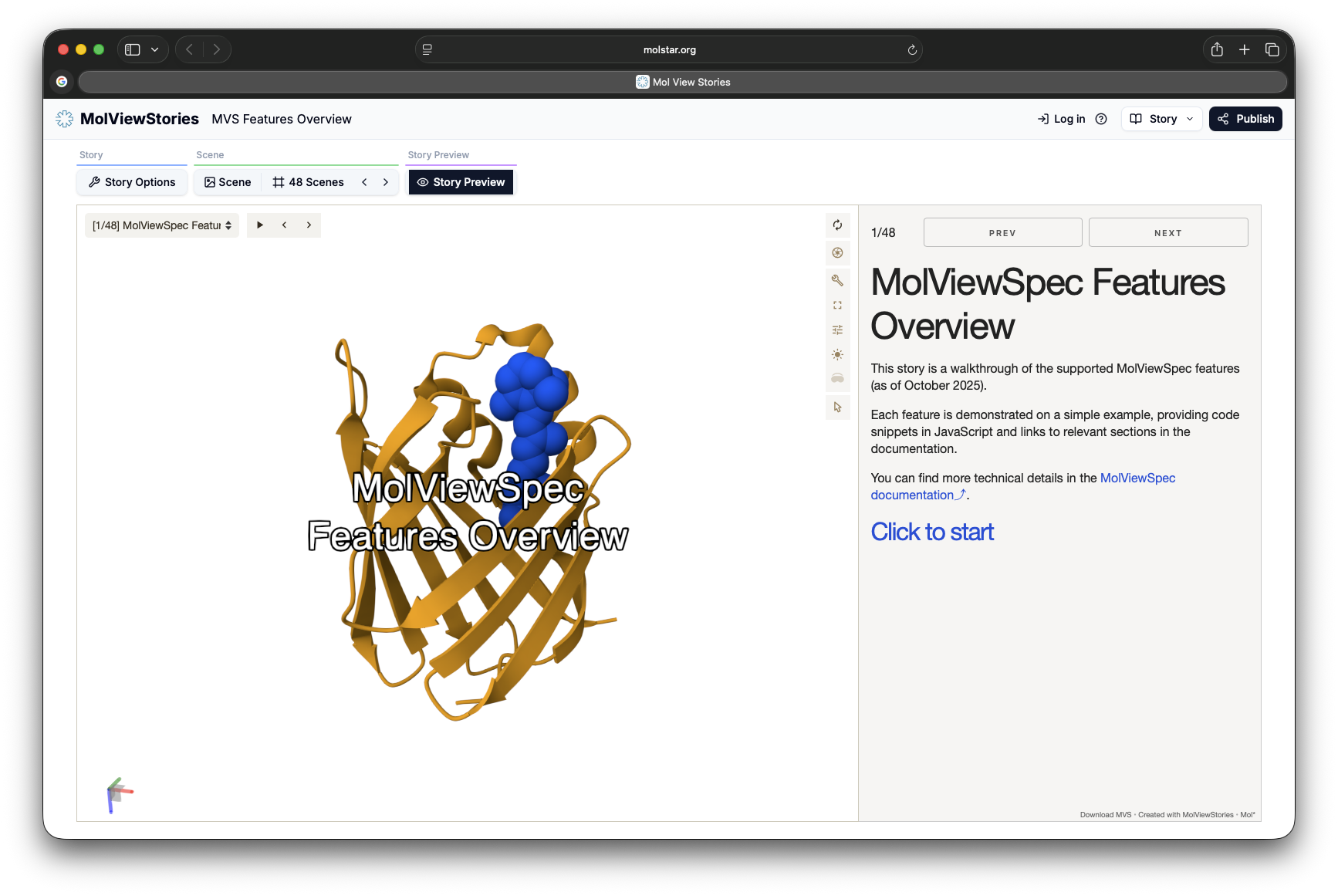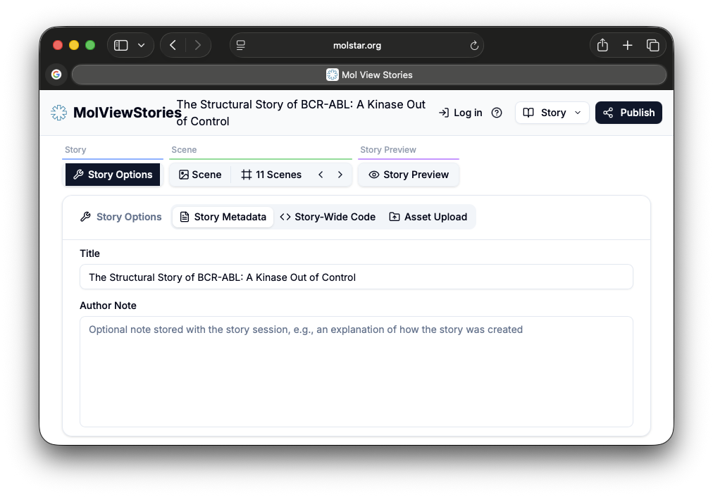 The Mol-View-Stories web application aims to provide a straighforward way to write stories. A Story is a set of scenes that share some common global settings and the story panels are where you can modify these settings. Within the Scene panels you can specify per-scene settings and in the Top Panel you can download your stories or , if you are logged in you can save them to the cloud.